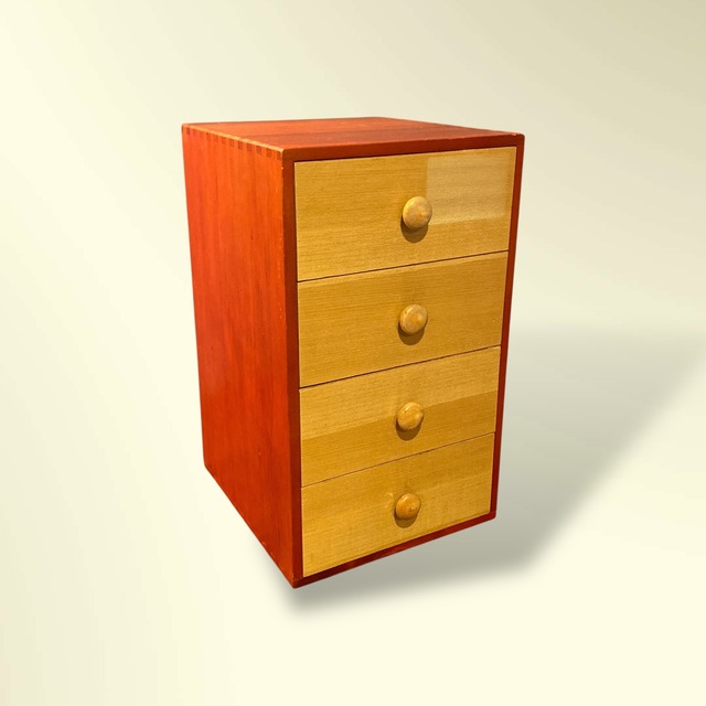1960年代頃のレトロポップな小引き出し。 赤みがかった色合いが素敵です。 ミッドセンチュリー、レトロポップな空間、和洋問わずお洒落な空間に馴染みます。 【サイズ(約/cm)】 横幅21 奥行22 高さ35.5 【コンディション】 若干のスレ、ヤケがあります。 使用には全く影響しません。 お気軽にお問合せ、ご購入お願いします。