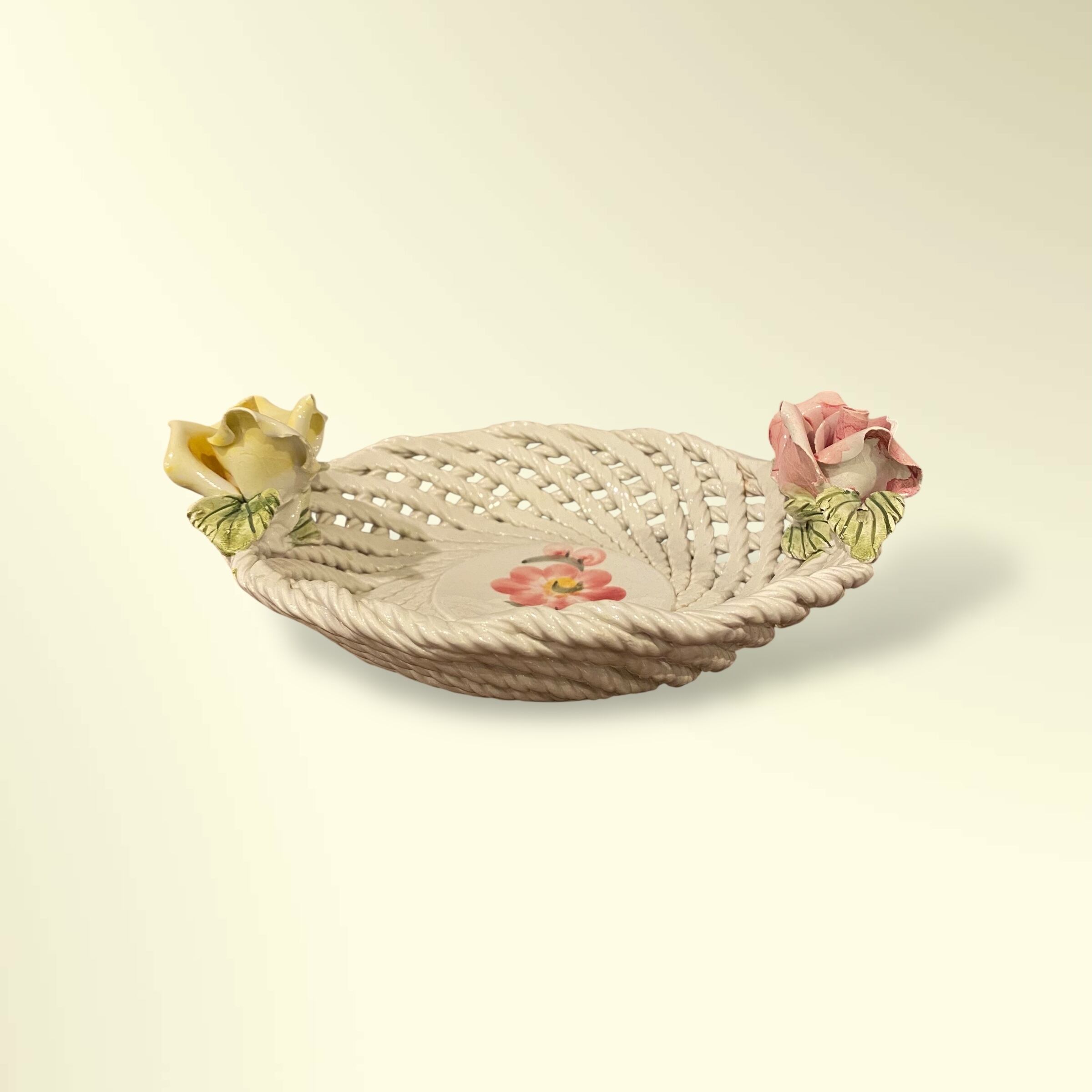 イタリア製 ヴィンテージ フルーツバスケット 小物入れ 陶器 薔薇 網目