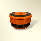 朱色の漆塗りに絣柄のレトロな雰囲気。