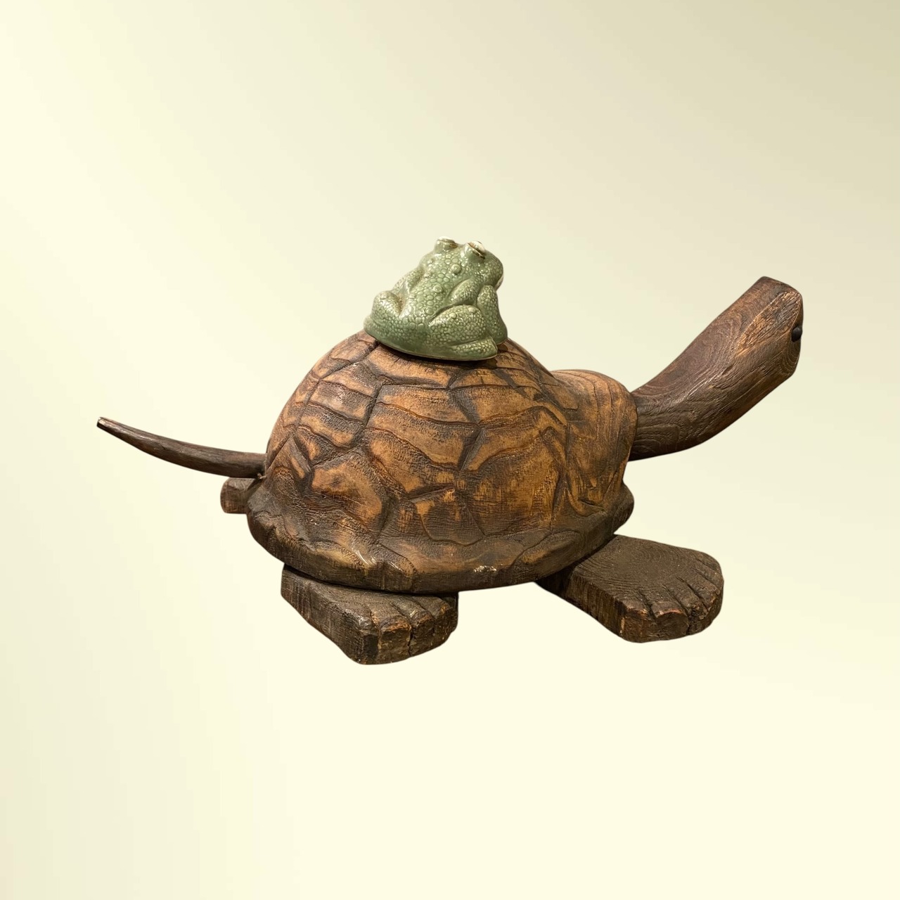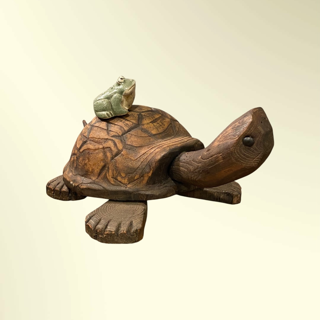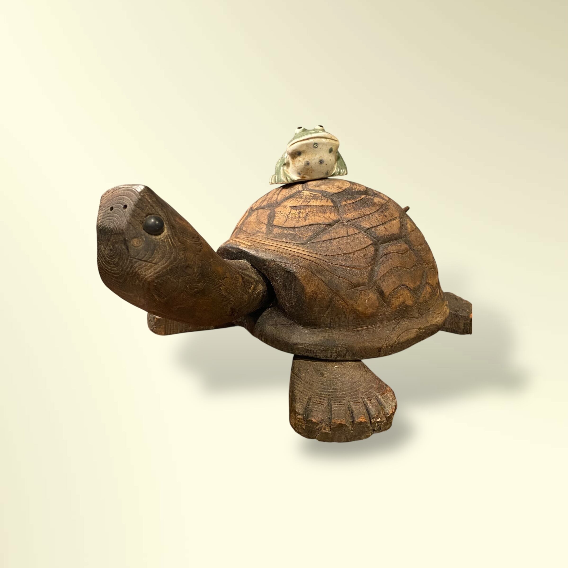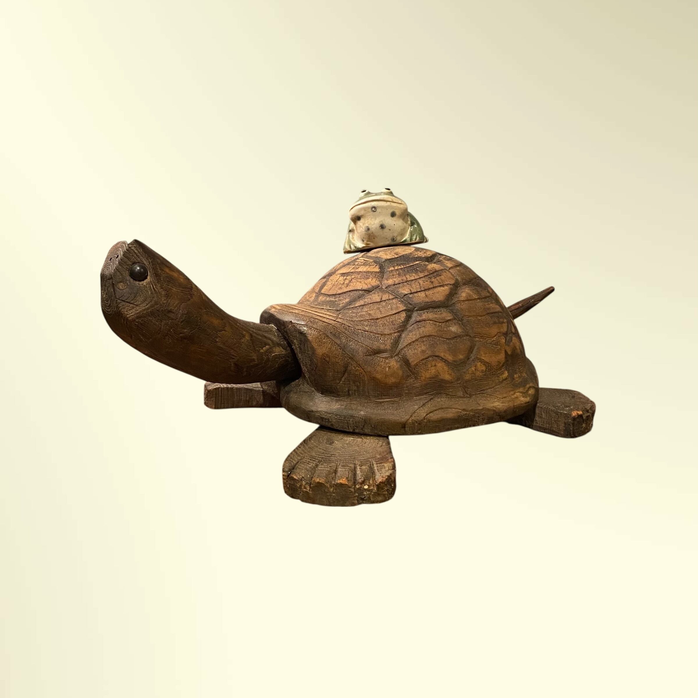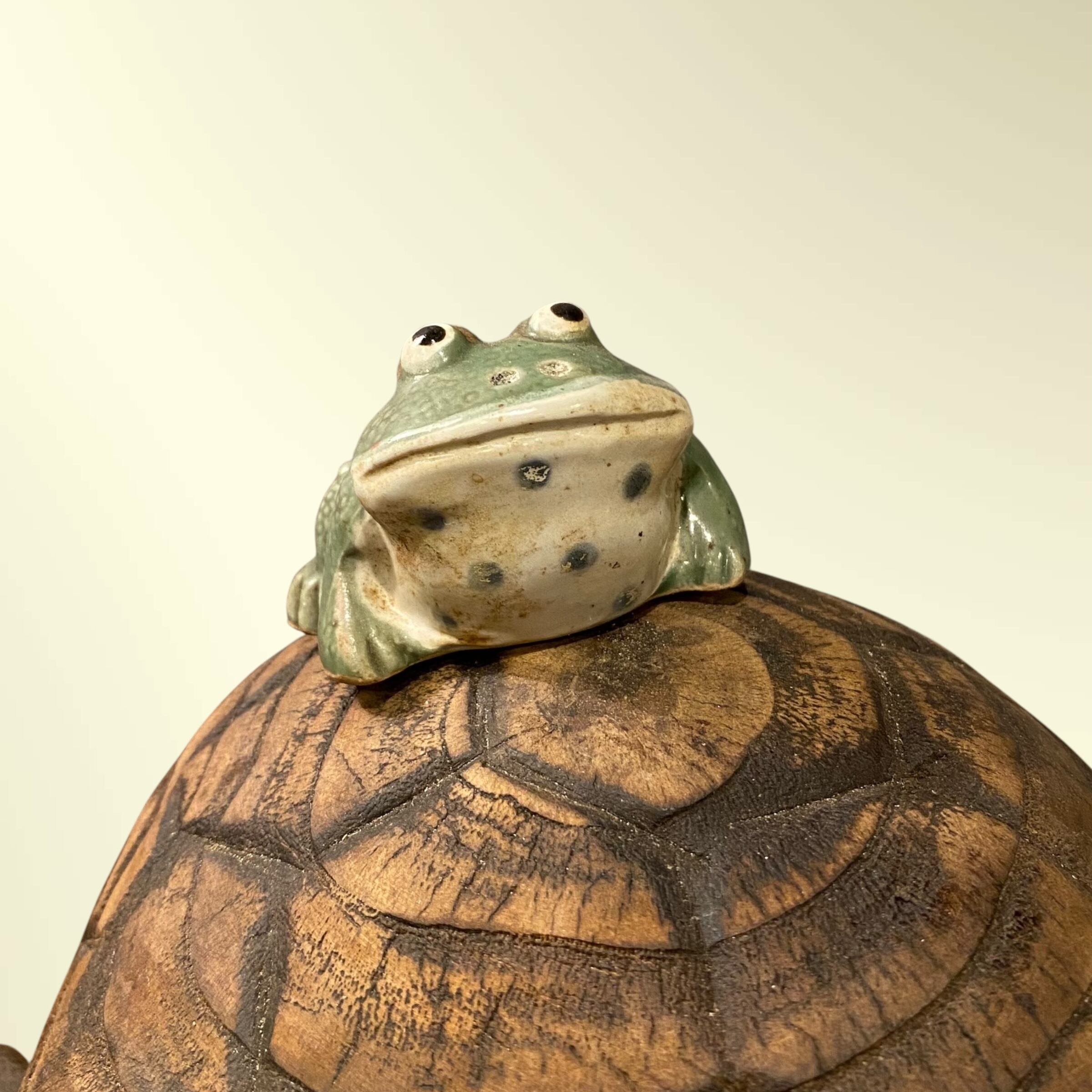 甲羅の上には陶器製のカエルが乗っています。