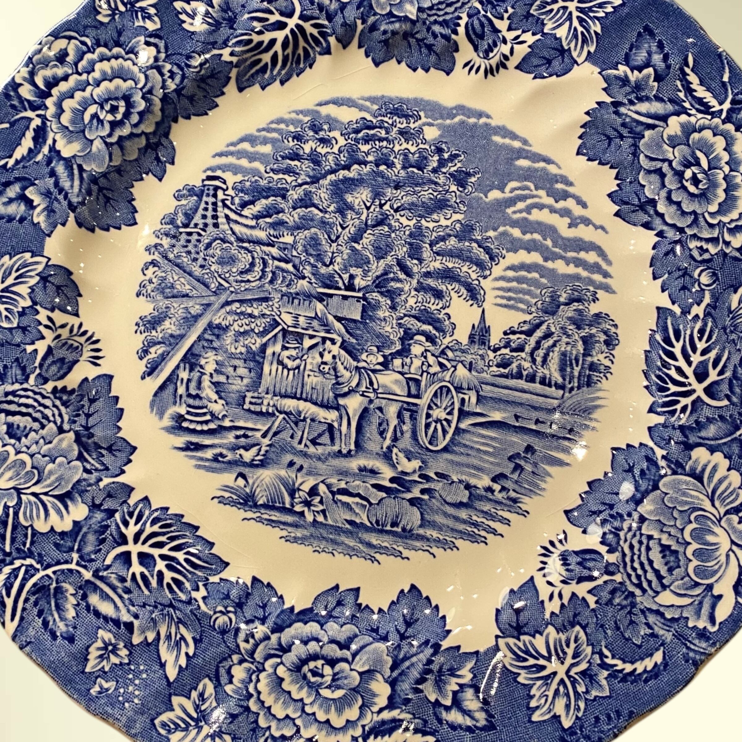 ブルー&ホワイトの銅版転写技術を用いた、英国の田園風景パターン。