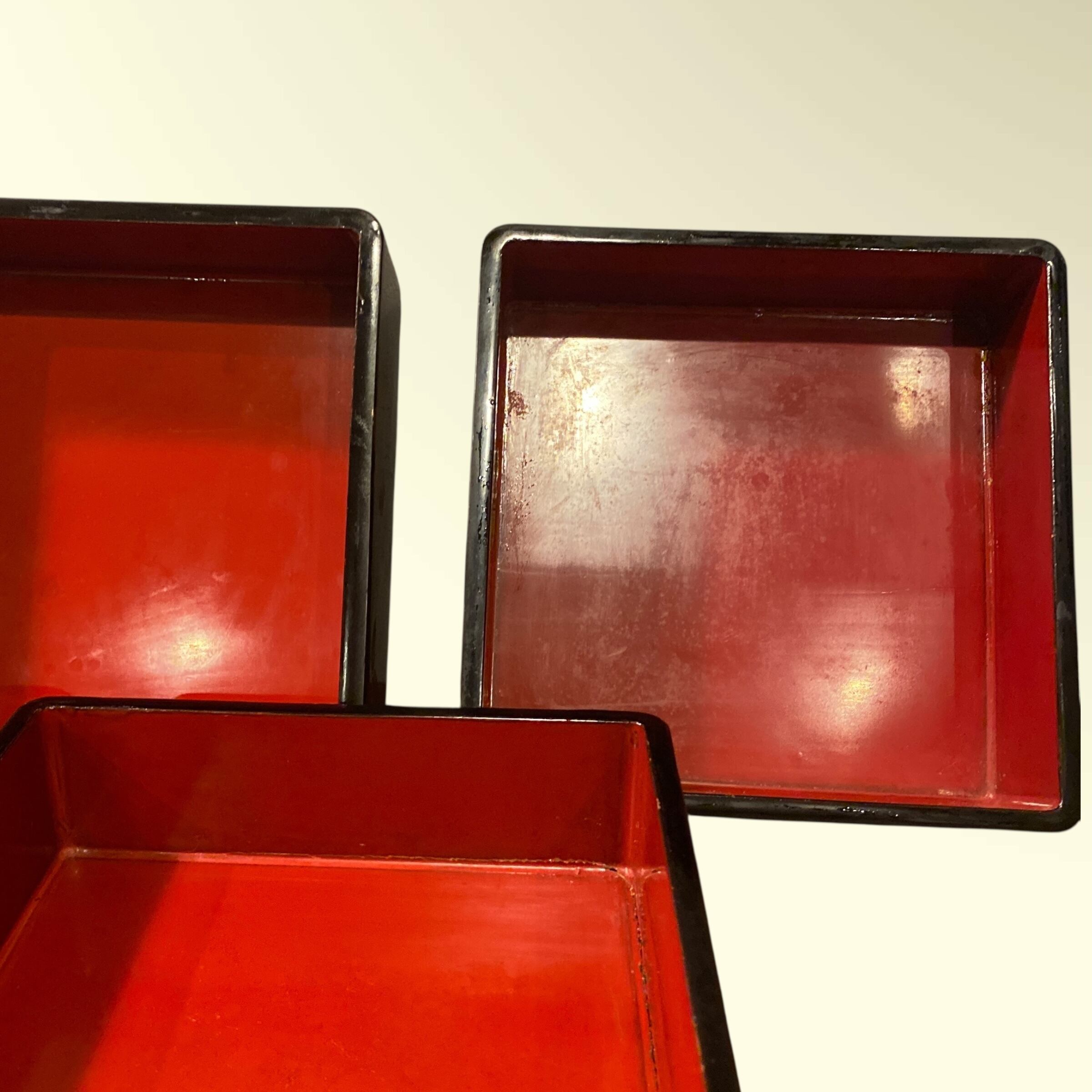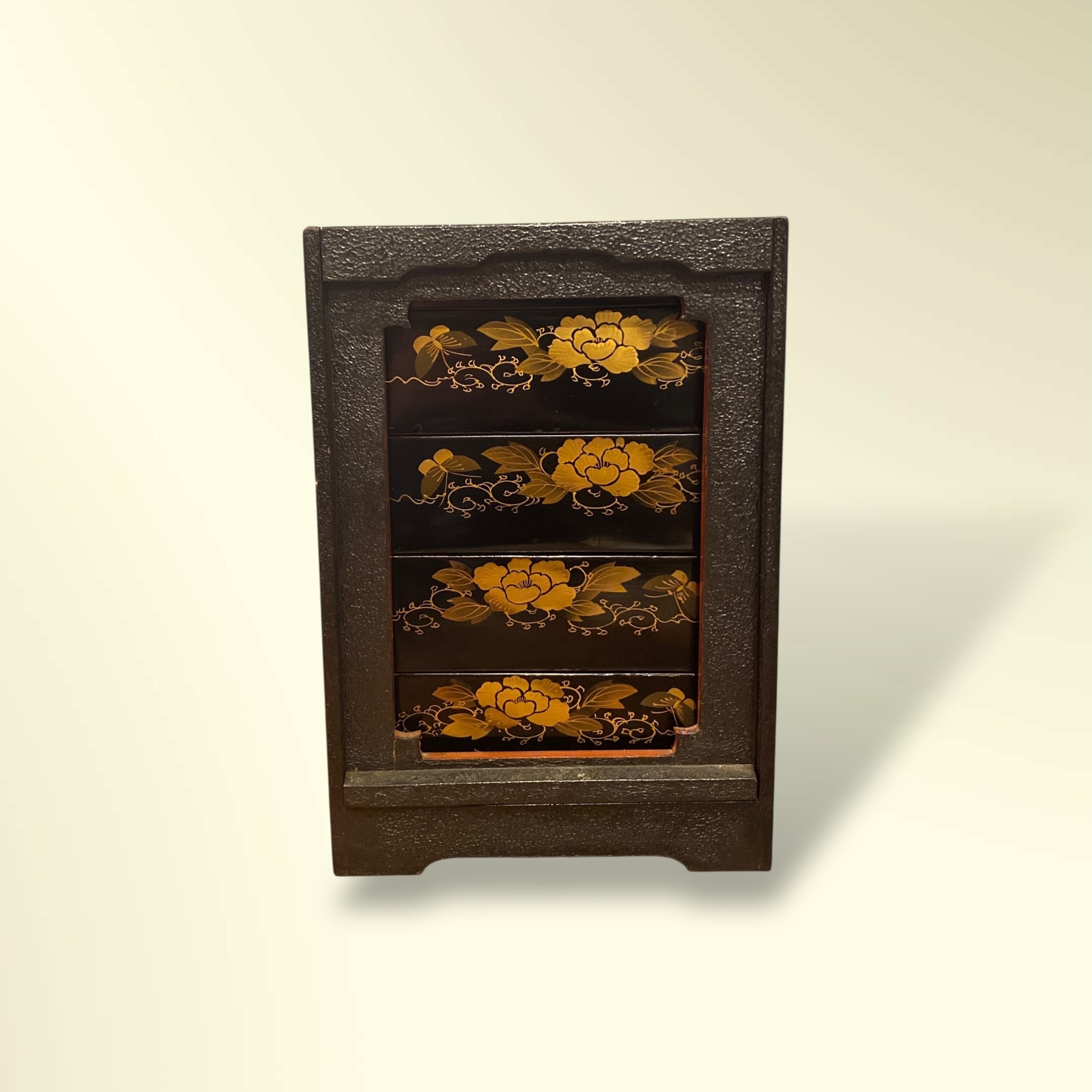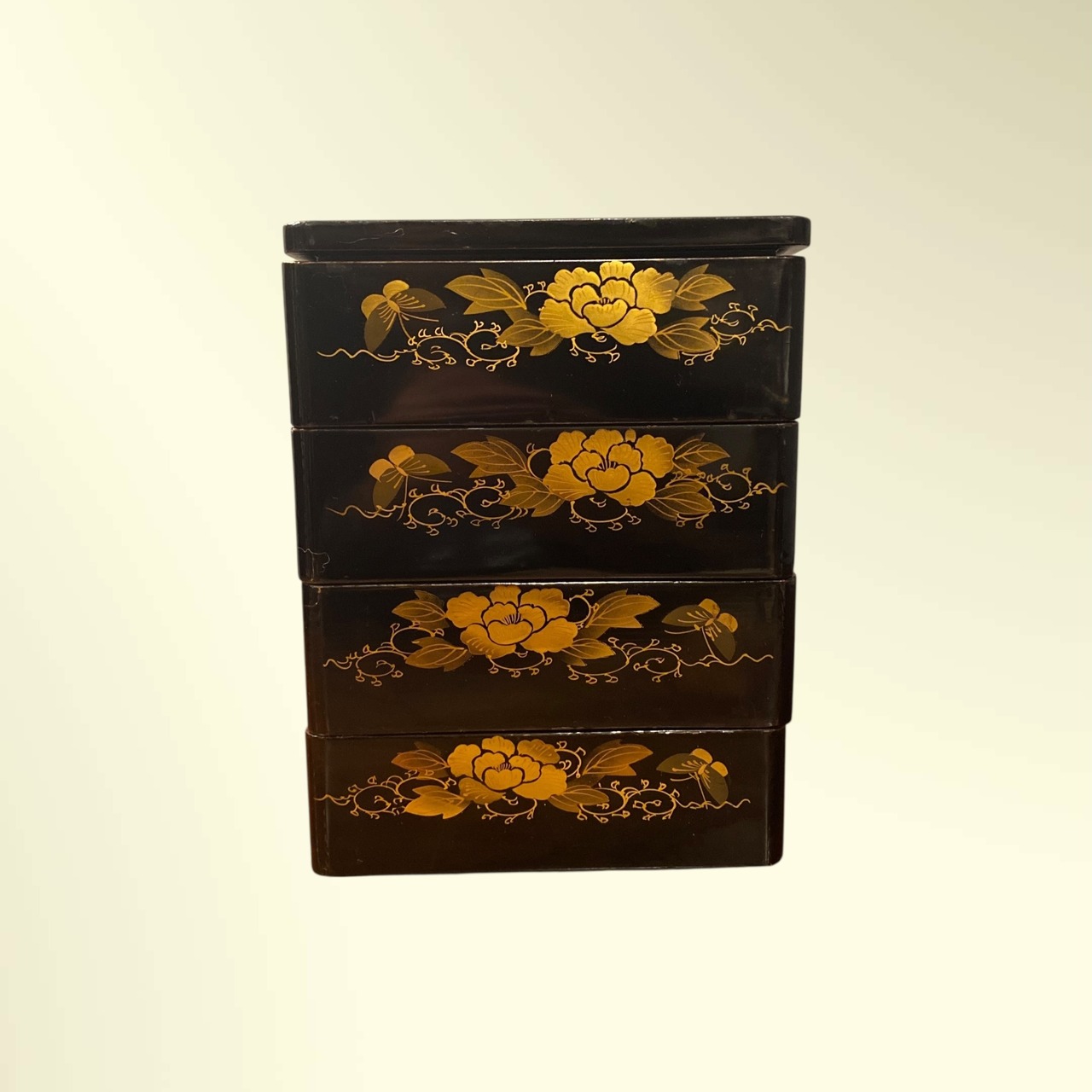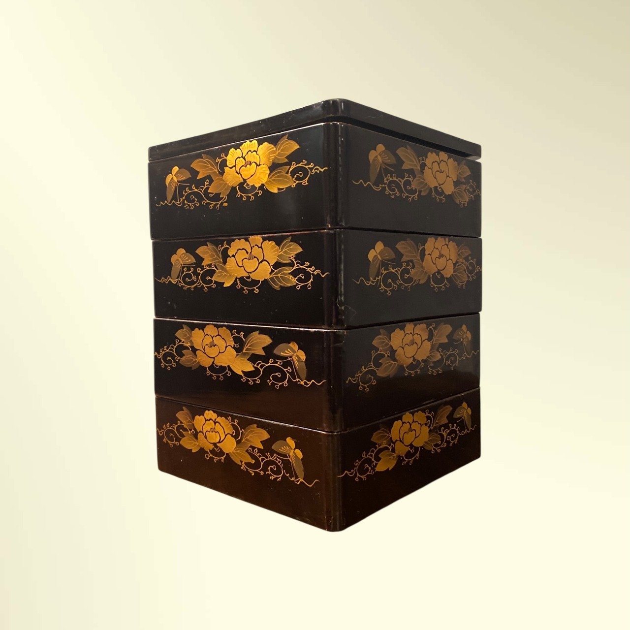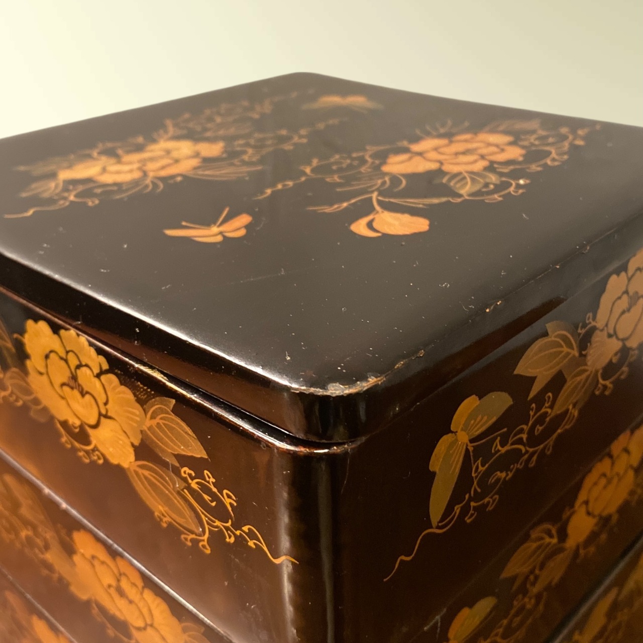 重箱全面に花と蝶の蒔絵が描かれています。