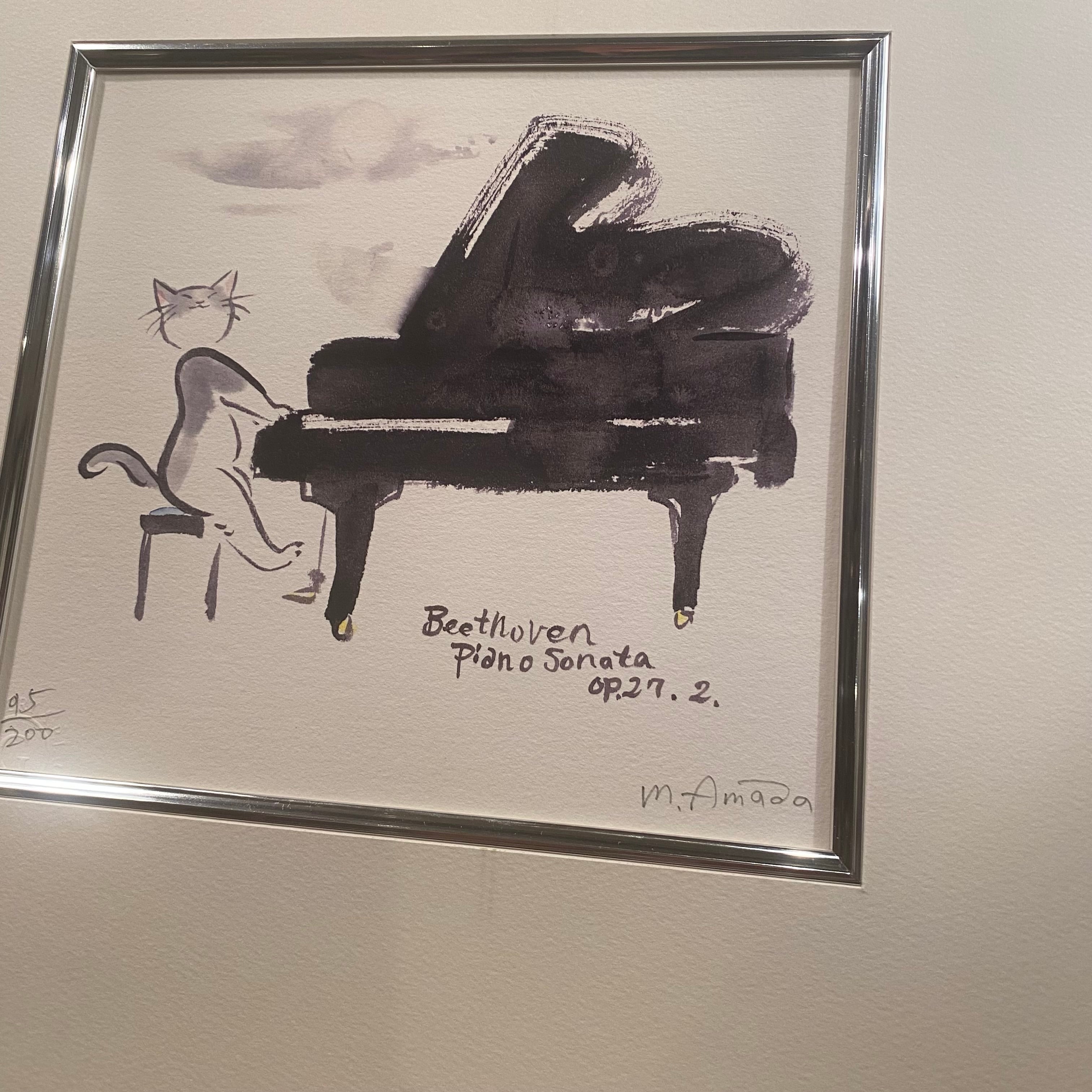 雨田光弘作のピアノを弾く猫のアート額装品。