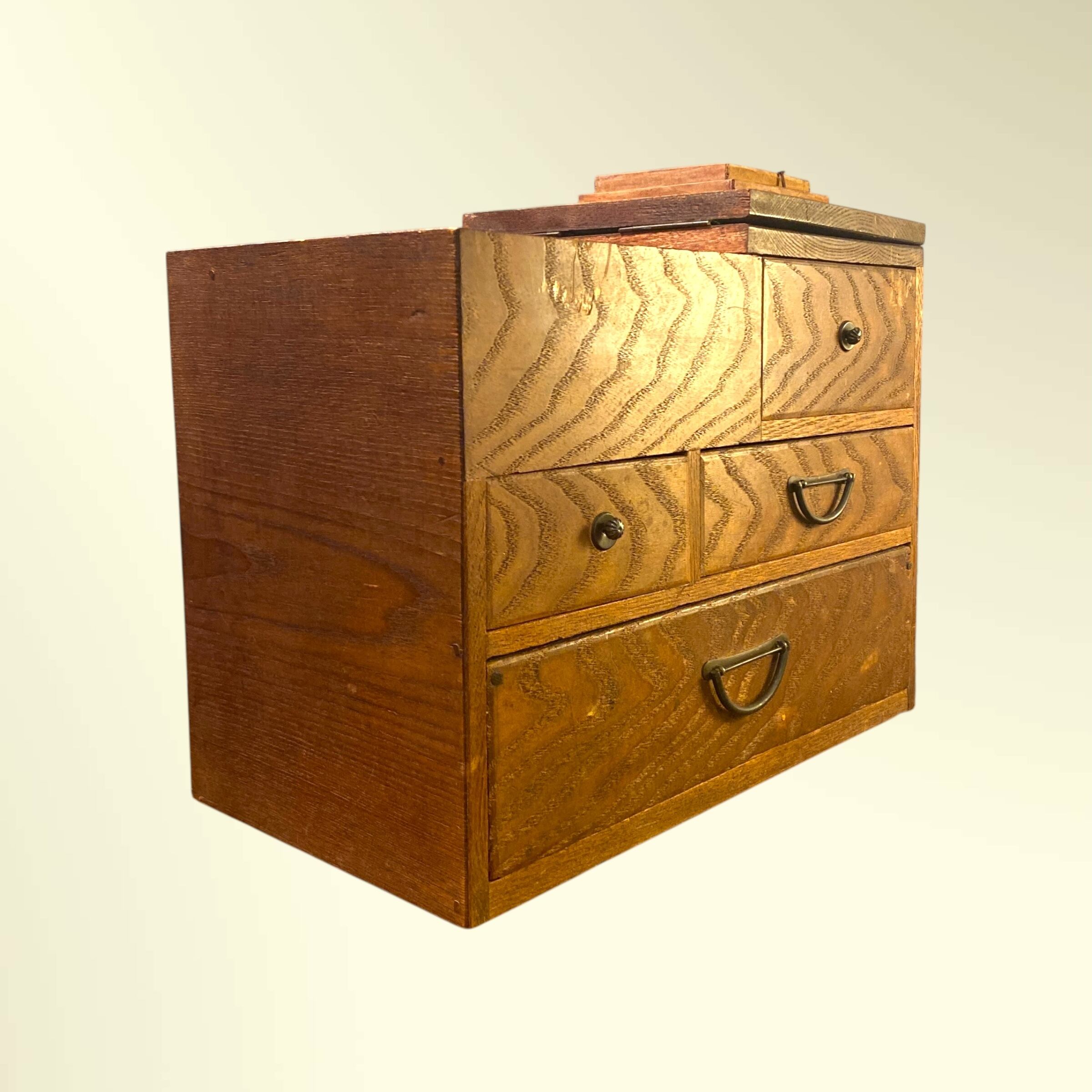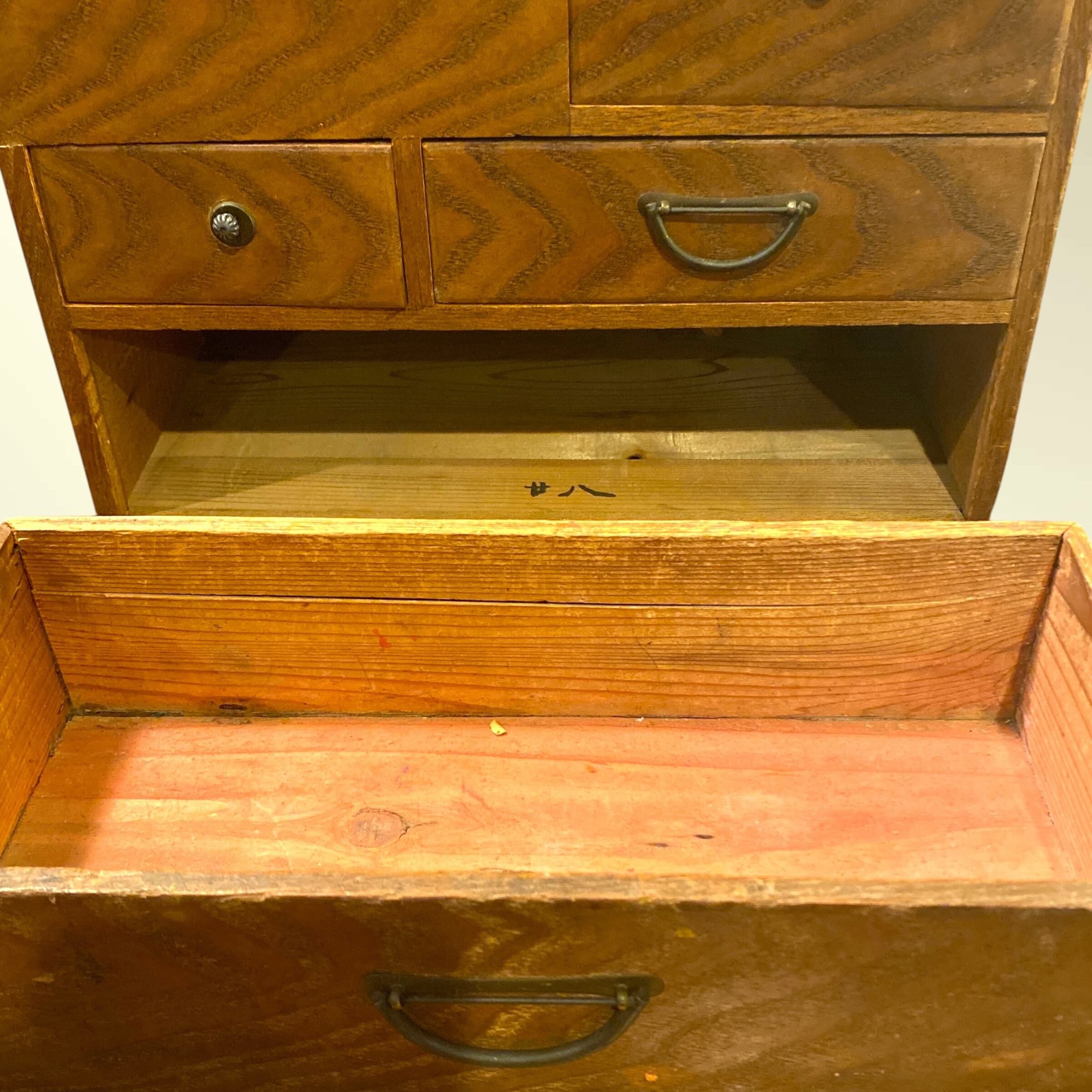 上部から銭を入れると最下段の引き出し奥に貯まる仕掛け付きです。