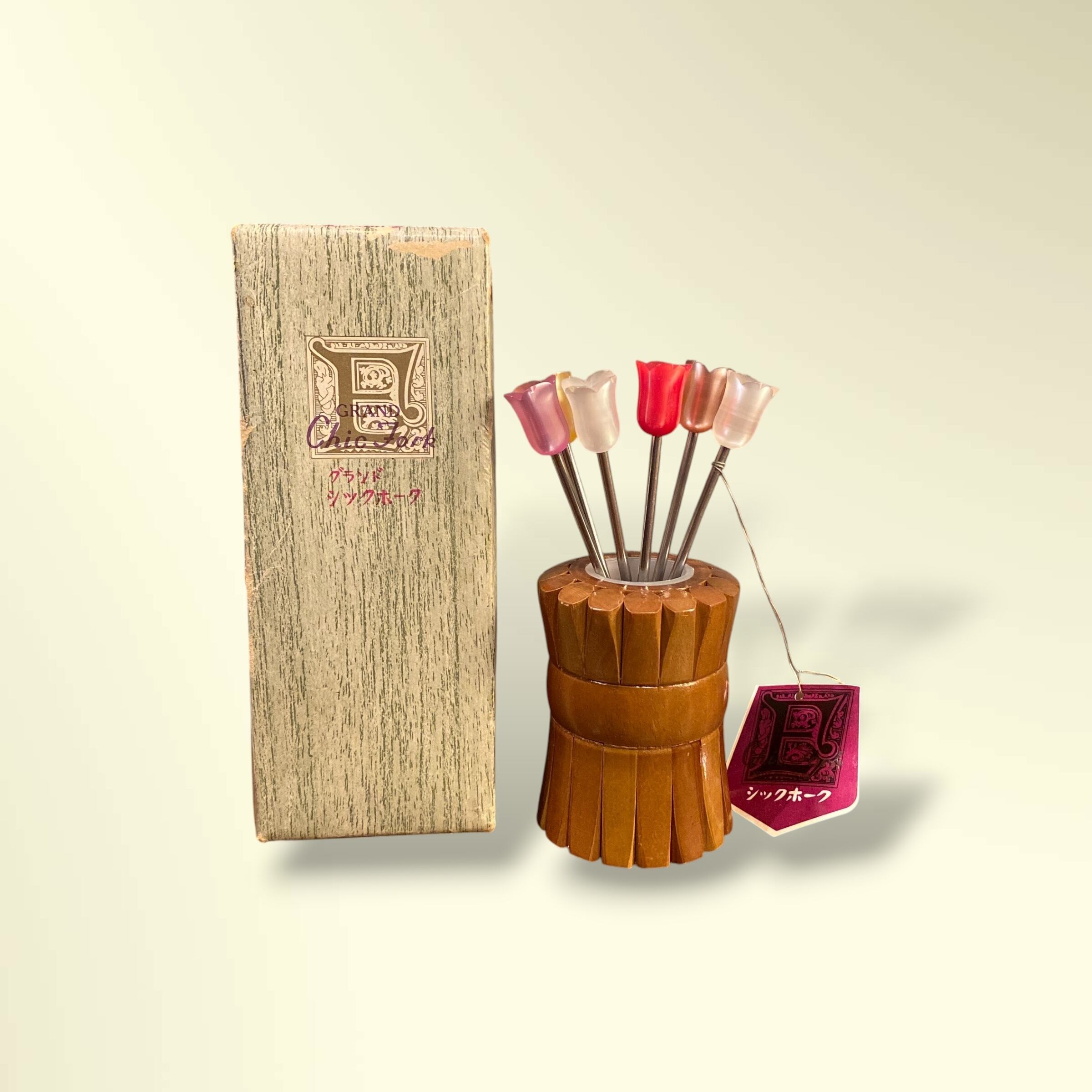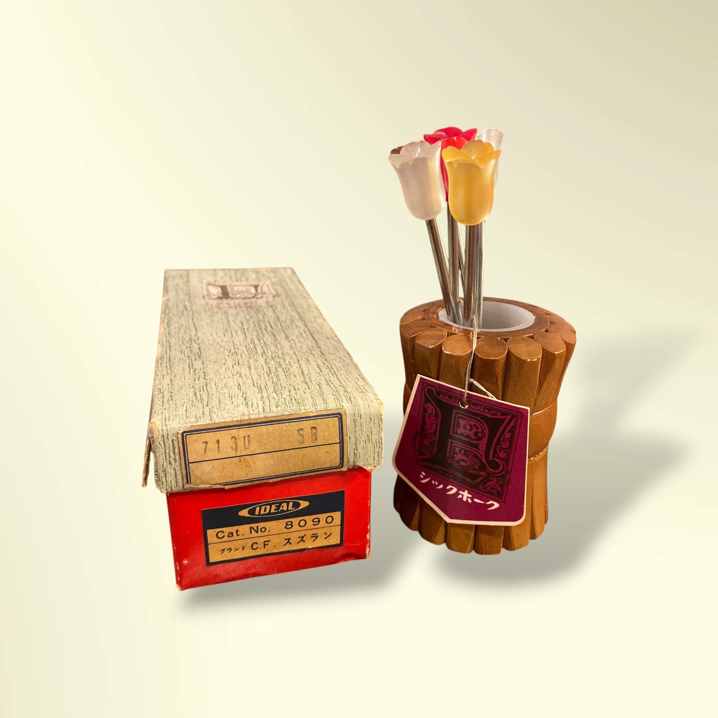 昭和レトロなIDEAL社製のデザートフォーク。 6色の花形のデザインが可愛らしいです。 箱付きの未使用保管品です。