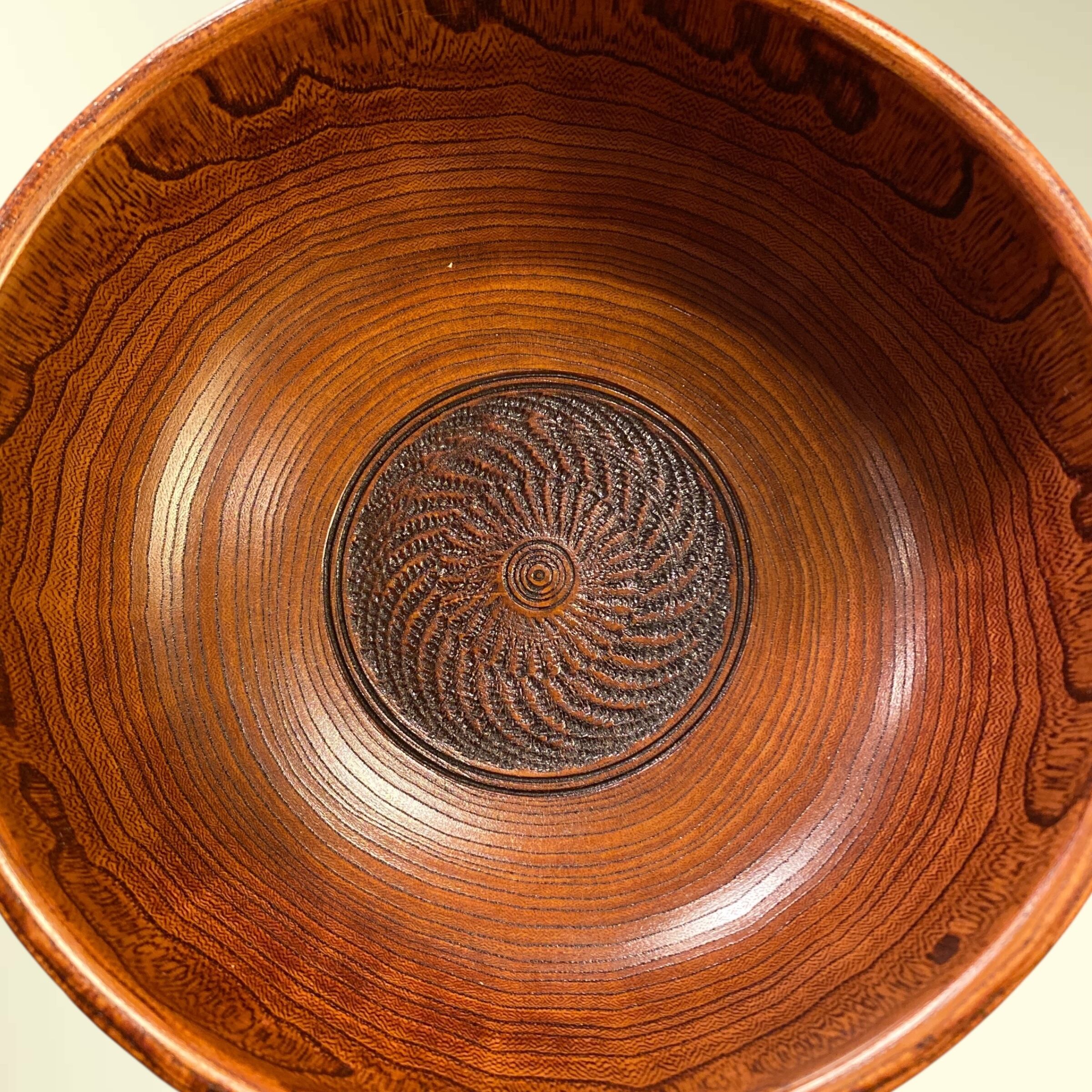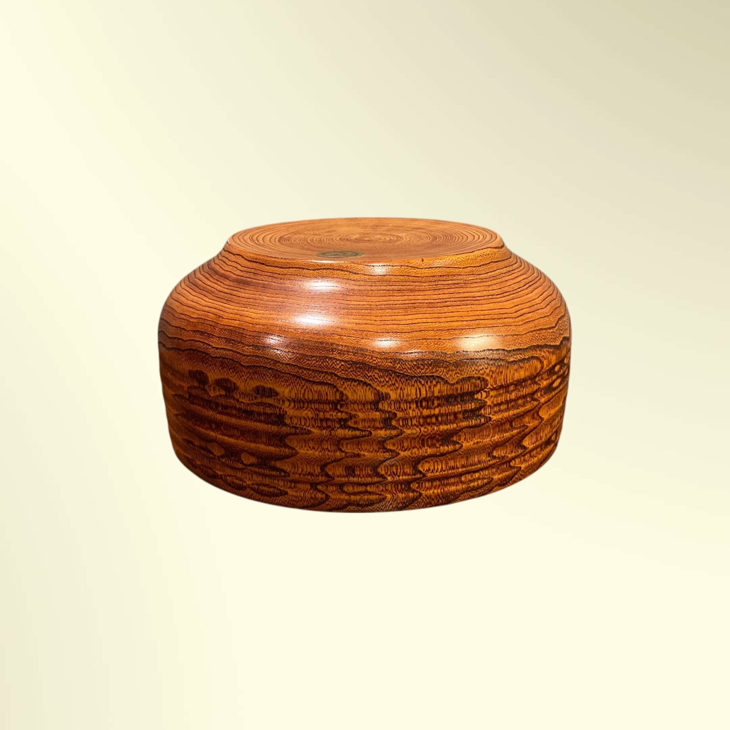 木目を生かした「拭き漆」仕上げと、底面に見られる「加飾挽き」と呼ばれる独特のろくろ技術が特徴です。